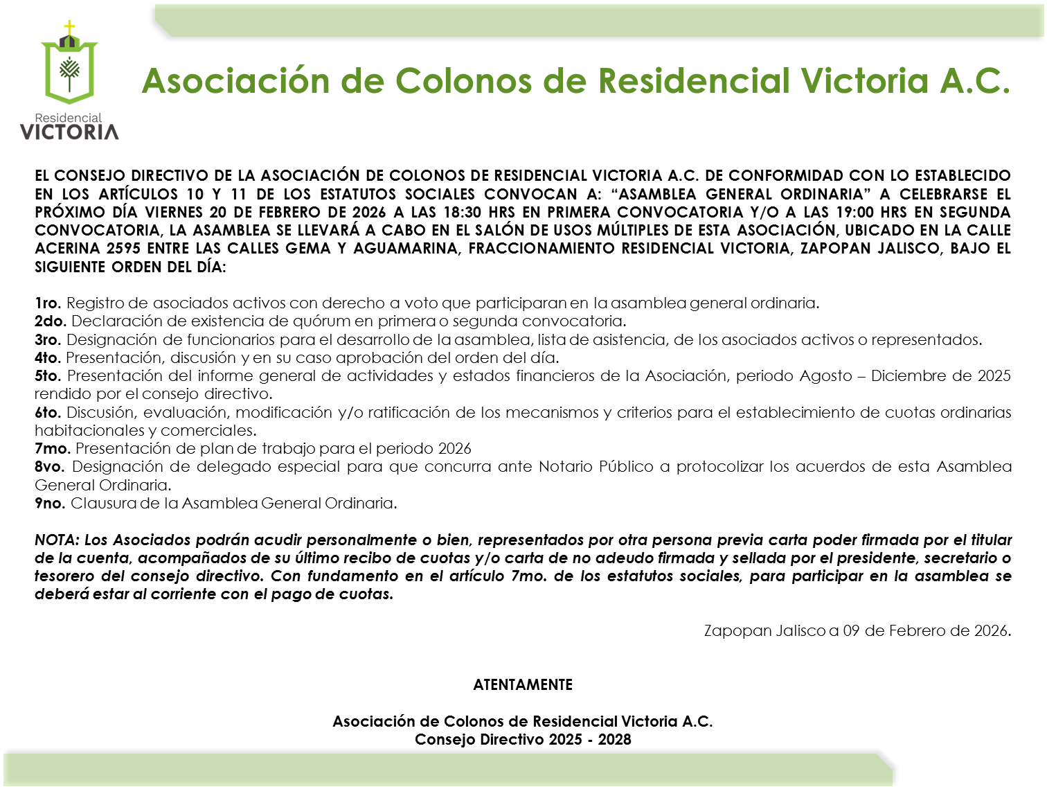 La Asociación de Colonos de Residencial Victoria A.C. es un emblema de cooperación y desarrollo comunitario, comprometida con garantizar un ambiente seguro y próspero para sus habitantes. Nos esforzamos por mantener y mejorar la calidad de vida de nuestros residentes, trabajando en unión para fomentar el progreso continuo de nuestro fraccionamiento, procurando la mejora continua de nuestro entorno, garantizando un incremento en la plusvalía y valor sustantivo de nuestras propiedades. Este esfuerzo colaborativo asegurará un futuro más próspero y sostenible para todos los residentes.